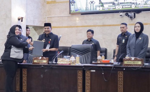 Gusti Miftahul Chotimah menyerahkan dokumen Kepada Ketua DPRD Kalsel, H Supian HK (poto : hms)