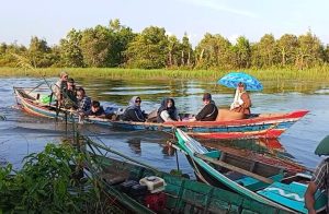 Namun desa ini tak dapat dijangkau dengan armada roda empat. Maka rombongan pun terpaksa naik perahu sampan menyusuri air, karena sebagian besar jalan masuk ke Desa Kali Besar masih tergenang banjir.